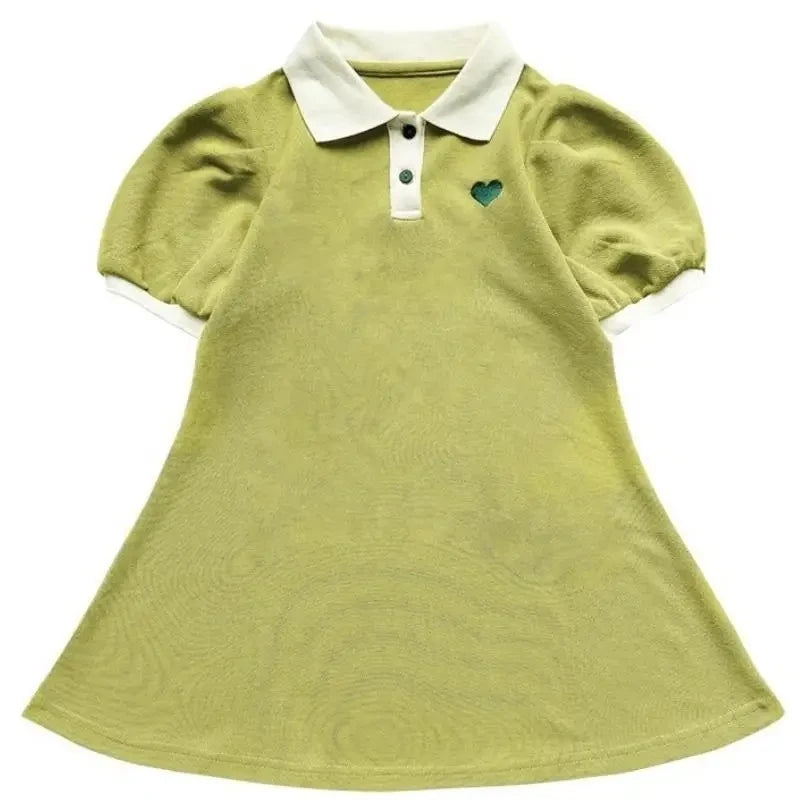2024 New Children's Summer Dress Girl's Korean Edition love Bubble Sleeves Flip Collar Dress 1-12 Year Old Princess Dress